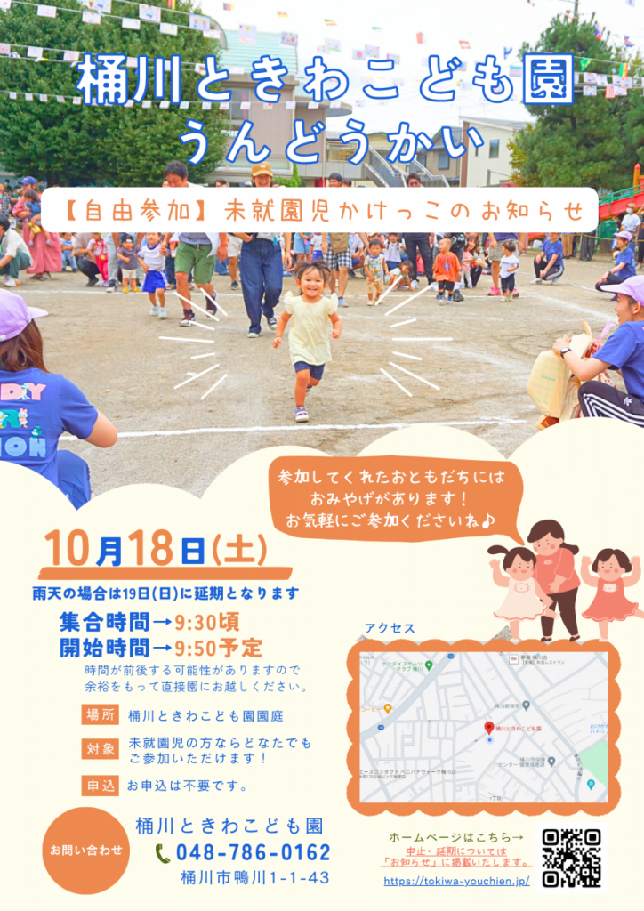 - 未就園児かけっこに参加される方は、9:30頃中庭に集合してください(9時50分頃に開始予定ですが、プログラムの進行により時間が前後する場合がございます。時間に余裕をもってお越しください)